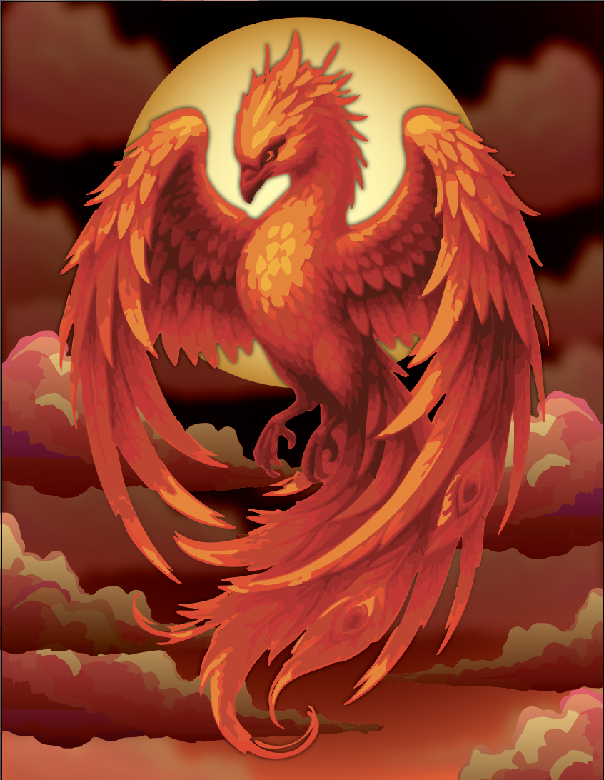 This digital illustration captures the legendary phoenix in a moment of radiant rebirth. Set against a glowing celestial sun and a backdrop of fiery, stylized clouds, the piece uses a vibrant spectrum of crimson and gold to emphasize the theme of transformation. The sharp linework and layered feathers create a sense of movement and intense energy, symbolizing the indestructible spirit of a creature that rises, renewed, from its own ashes.