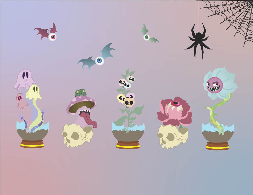 A study in asset design and themed illustration. This assignment focused on creating a consistent set of five unique icons, using Gradients and custom Stroke profiles to blend organic botanical shapes with macabre, surreal details.