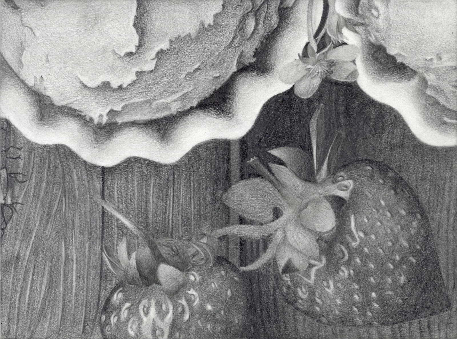 This piece is built on the sharp contrast between the deep, velvety shadows and the brilliant highlights of the fruit. I pushed the tonal range to its limit to pull the textures out of the page, letting the bright, reflective seeds of the strawberries pop against the darker, matte folds of the cupcake wrappers. Topping it with a single, delicate flower in the upper-right center provides a final point of clarity.